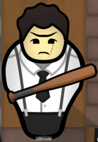 - A large body of pale skin with black hair. He has a scar under one of his eyes.